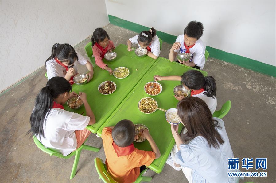 6月2日,馬武寨寄宿制小學(xué)的學(xué)生們和老師在食堂內(nèi)吃飯。新華社記者楊晨光攝。
