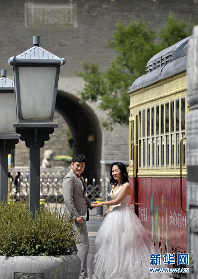 6月3日,一對年輕人在前門步行街拍攝婚紗照片。近日,游人和市民紛紛來到北京市的王府井、西單、前門大街等著名商業(yè)街購物休閑,這些老商業(yè)街開始逐步恢復(fù)昔日的繁華。新華社記者李欣攝。