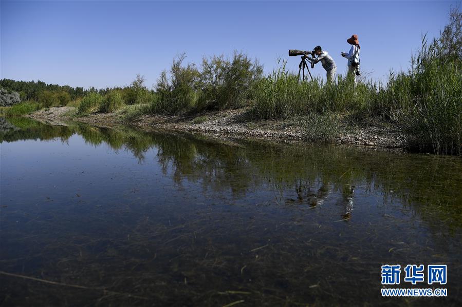 6月3日,李學(xué)明(左)和同事在黃河濕地監(jiān)測(cè)、拍攝鳥(niǎo)類活動(dòng)。新華社記者馮開(kāi)華攝。
