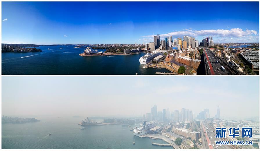 這張拼版照片顯示的是2018年7月6日(上)和2019年12月19日拍攝的澳大利亞悉尼港區(qū)的空氣質(zhì)量對比效果。2019年中至2020年初,持續(xù)半年左右的澳大利亞森林火災造成嚴重的環(huán)境災難。6月5日是第47個聯(lián)合國世界環(huán)境日,今年的主題為“關(guān)愛自然刻不容緩”。新華社記者白雪飛攝。