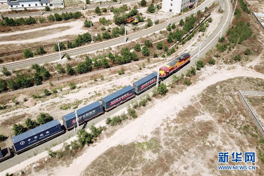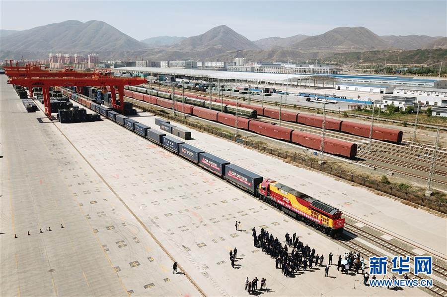 6月5日,在甘肅蘭州國際陸港,“中吉烏”公鐵聯(lián)運國際貨運班列發(fā)車(無人機照片)。新華社記者范培珅攝。