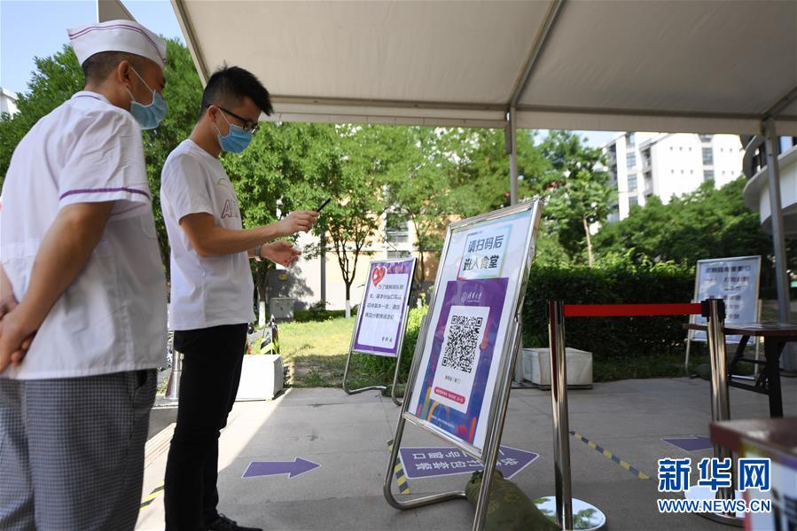 6月6日,在清華大學(xué)一個(gè)學(xué)生食堂門前,一名返校學(xué)生按要求掃碼驗(yàn)證信息。 新華社記者 鞠煥宗 攝