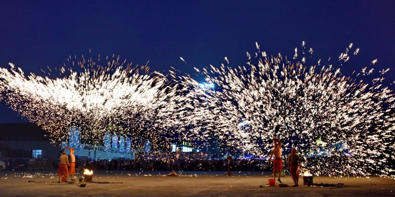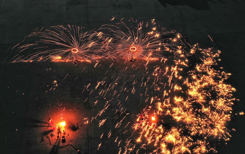2020年6月7日晚8時(shí)許,吉林長春青岡立交橋附近,神韻打鐵花表演隊(duì)改進(jìn)了傳統(tǒng)單一的擊打鐵花的形式,增添了空中轉(zhuǎn)花、高空散花、鋪地印花等多種花型。一柱鐵花沖天,在空中盤旋,朵朵銀花綻放給觀眾帶來了震撼的視覺享受。