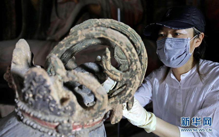 6月8日,工作人員對(duì)奉國(guó)寺的彩繪泥塑進(jìn)行保護(hù)修復(fù)。新華社記者姚劍鋒攝