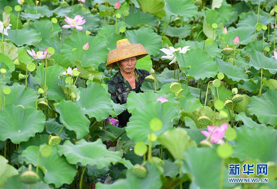 6月9日,村民在海口龍華區(qū)龍泉鎮(zhèn)美仁坡村采摘蓮蓬。初夏時(shí)節(jié),位于海南??邶埲A區(qū)龍泉鎮(zhèn)的蓮蓬逐漸成熟,當(dāng)?shù)卮迕窦泳o采摘,一派繁忙景象。新華社記者蒲曉旭攝