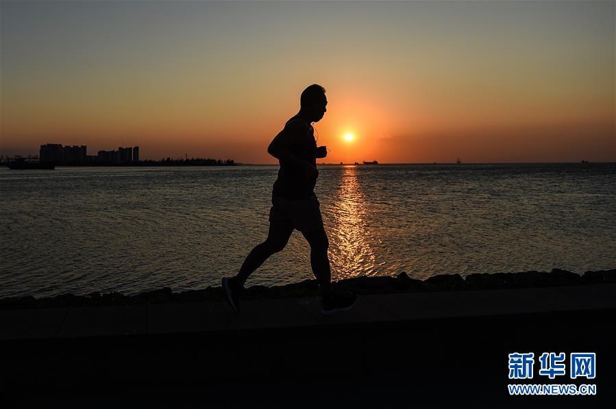 夜幕將至,一位市民在??谑兰o公園濱海步道跑步(5月15日拍攝)。近年來,夜跑成為越來越多都市人熱衷的健身方式之一。在海南??冢慨?dāng)夜幕降臨,“夜跑族”來到??谌f綠園、世紀公園等夜跑場所跑步,用一身酣暢淋漓的汗水?dāng)[脫白天工作中的壓力,享受跑步帶來的歡愉。新華社記者 蒲曉旭 攝