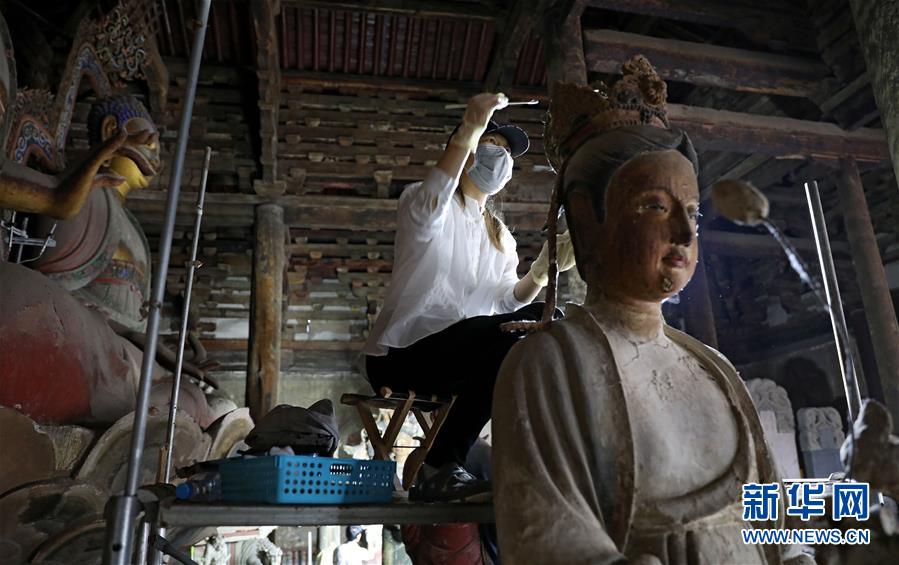 6月8日,工作人員對奉國寺的彩繪泥塑進行保護修復。