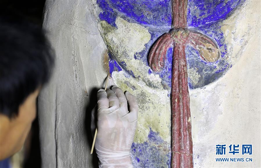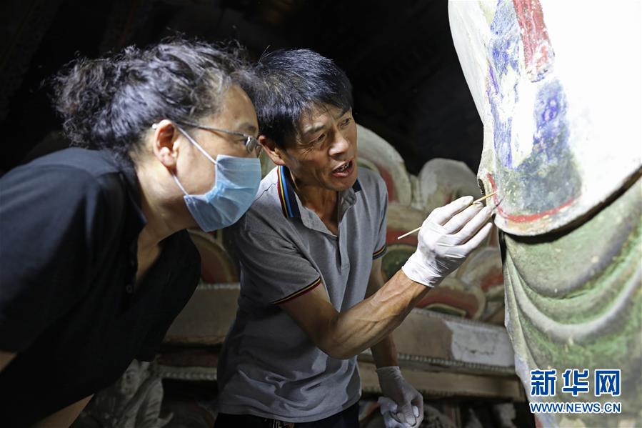 6月8日,工作人員對奉國寺的彩繪泥塑進(jìn)行保護(hù)修復(fù)。新華社記者 姚劍鋒 攝