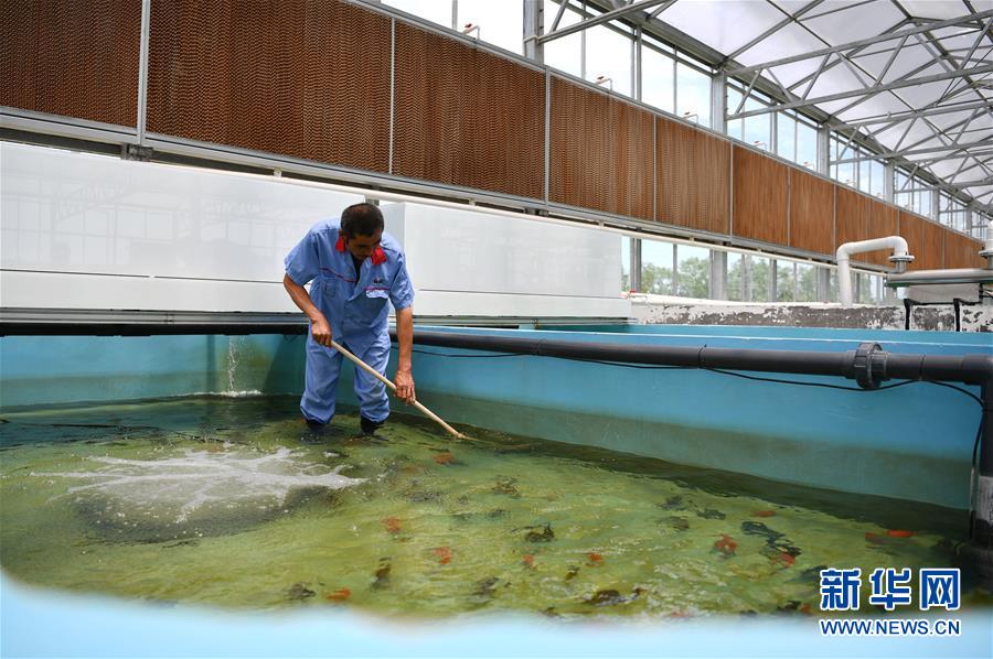 在天津現(xiàn)代晨輝科技集團有限公司的養(yǎng)殖示范場,工人在清潔魚池(6月15日攝)。新華社記者 李然 攝