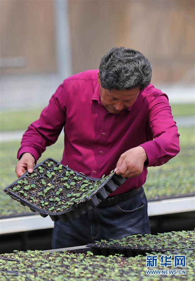 在遼寧省盤錦市大洼區(qū)新興鎮(zhèn)坨子里村,劉廣會(huì)在自己經(jīng)營(yíng)的育苗企業(yè)內(nèi)查看蔬菜種苗生長(zhǎng)情況(6月9日攝)。新華社記者 楊青 攝