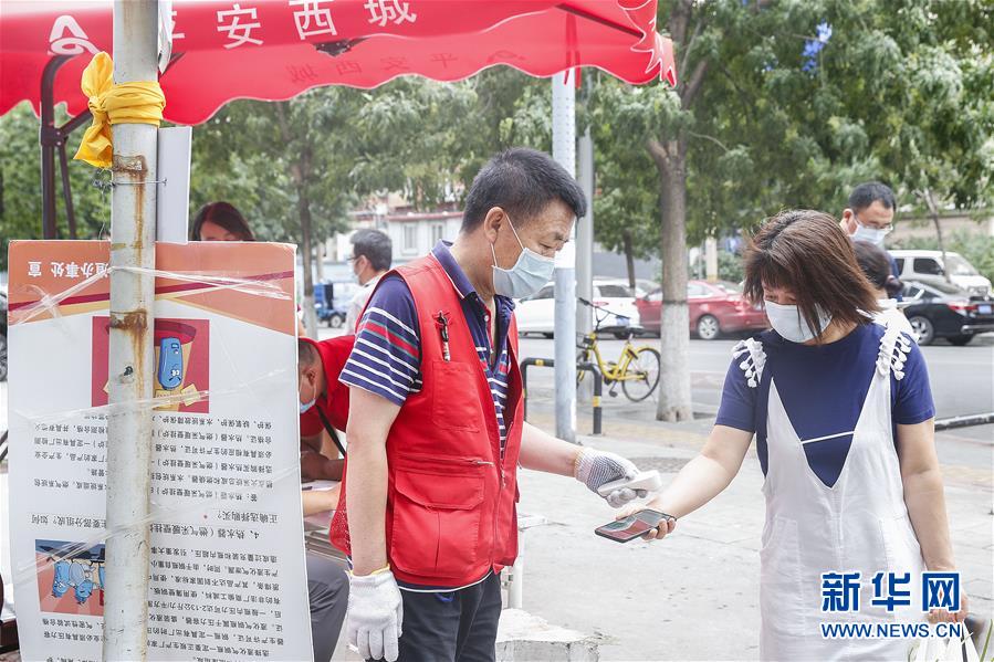 6月17日,一位工作人員在北京市西城區(qū)廣外街道小馬廠東社區(qū)的入口為居民測(cè)量體溫。新華社記者 張玉薇 攝