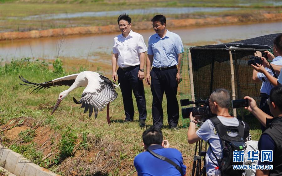 當(dāng)日,江西省林科院野生動(dòng)植物救護(hù)中心在萬年縣鄱陽湖畔放飛三只被救助的東方白鸛。