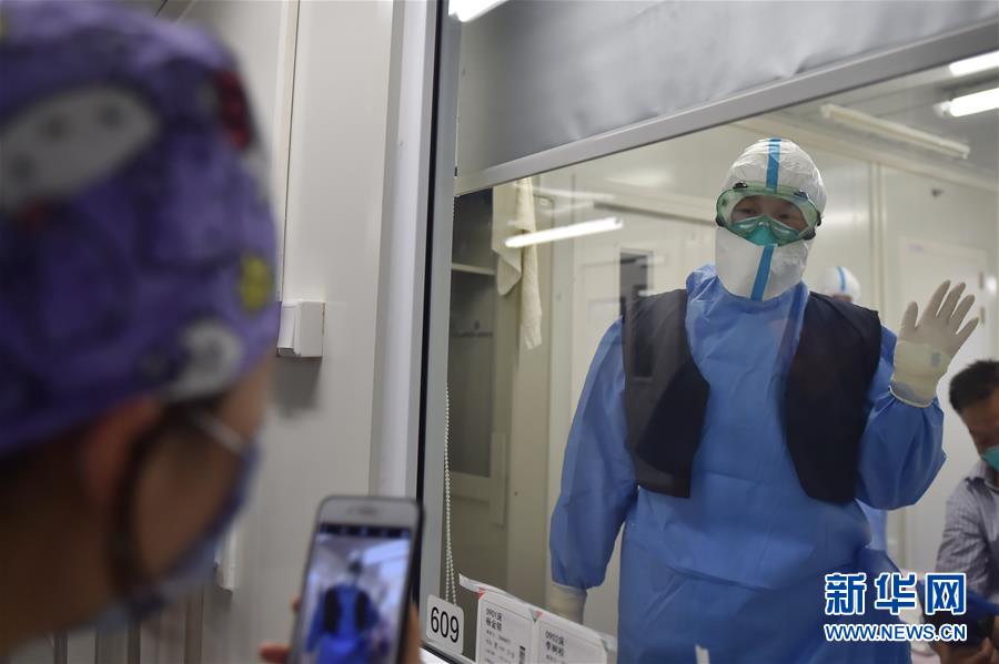 6月19日,在北京地壇醫(yī)院隔離病房?jī)?nèi),護(hù)士穿上同事送來(lái)的降溫馬甲后,向同事打招呼感謝。新華社記者彭子洋攝
