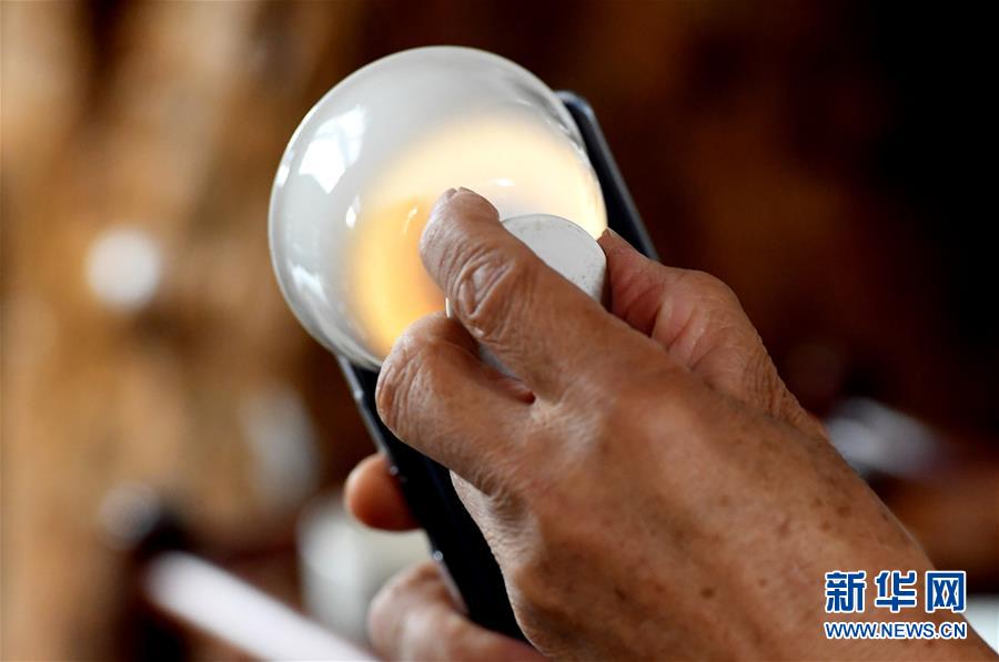 在河南省鞏義市站街鎮(zhèn)小黃冶村的工作室里,游光明在展示燒制的透影白瓷作品(6月19日攝)。新華社記者李安攝