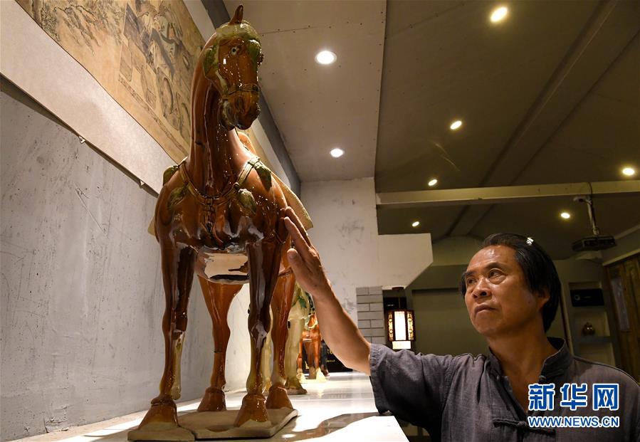 在河南省鞏義市站街鎮(zhèn)小黃冶村,與唐三彩古窯址相鄰處的一個工作室里,63歲的游光明擦拭著自己燒制的“三彩雕花杯”,并不時向記者介紹著它的制作工藝和獨特之處。