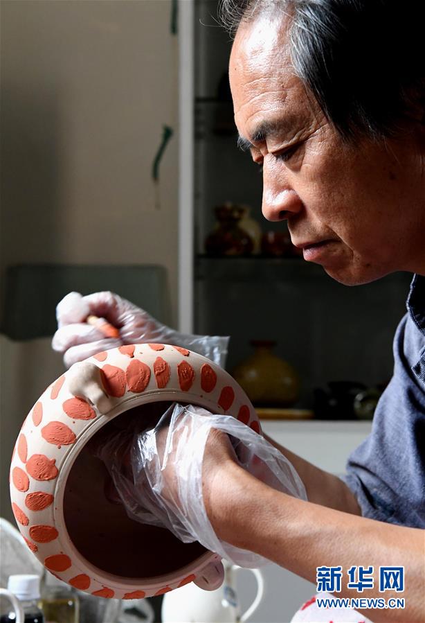在河南省鞏義市站街鎮(zhèn)小黃冶村的工作室里,游光明運用點彩手法施釉(6月19日攝)。新華社記者李安攝