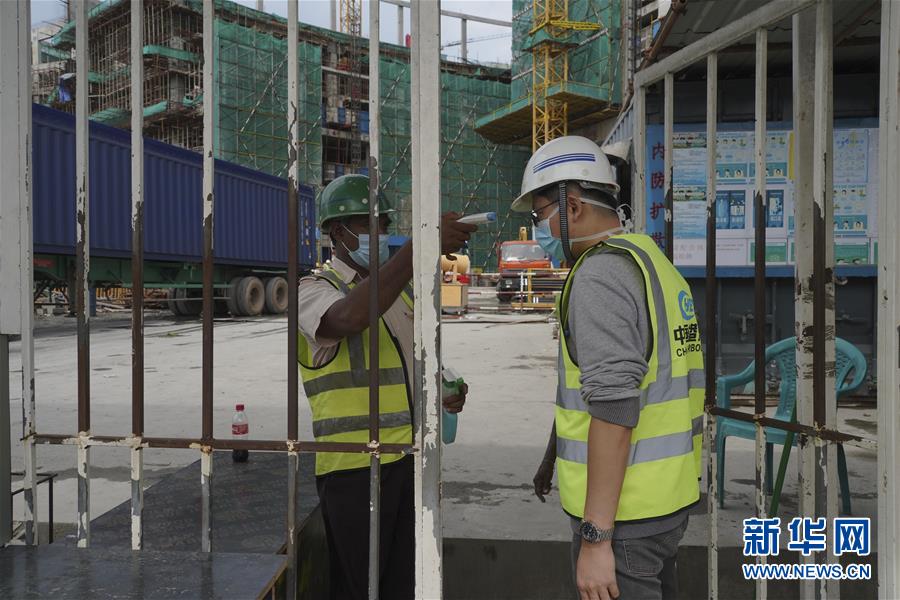 6月21日,在斯里蘭卡首都科倫坡,一名工人在中國(guó)港灣科倫坡房建項(xiàng)目工地門(mén)口接受體溫檢測(cè)。新華社記者唐璐攝