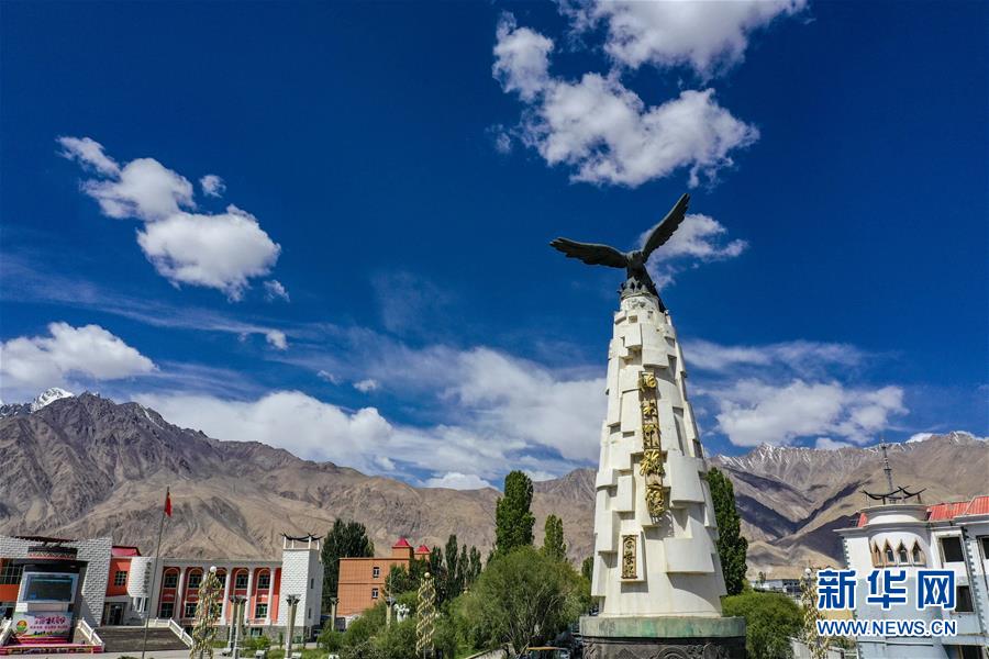 這是位于新疆塔什庫爾干塔吉克自治縣縣城的“帕米爾雄鷹”雕塑(6月20日攝,無人機(jī)照片)。新華社記者胡虎虎攝