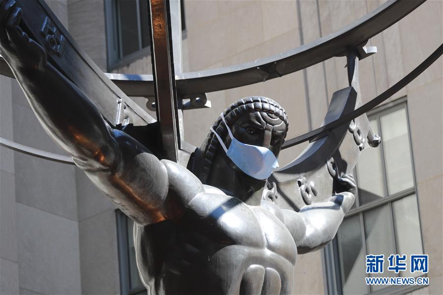 6月22日,在美國紐約洛克菲勒中心,一座雕像被“戴”上口罩。美國約翰斯·霍普金斯大學22日發(fā)布的新冠疫情最新統(tǒng)計數(shù)據(jù)顯示,美國累計死亡病例超過12萬例。新華社記者王迎攝