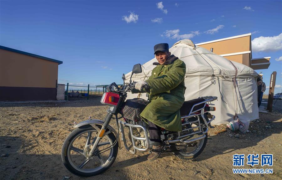 在吉木乃縣萬駝園內(nèi),傍晚時分,牧民米拉木別克·阿依提克準備騎著摩托車將駱駝趕回圈內(nèi)(6月21日攝)。新華社記者趙戈攝