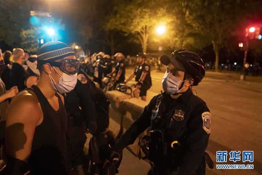 6月22日,警察和示威者在美國華盛頓白宮附近對(duì)峙。美國警察和示威者22日晚在首都華盛頓市白宮北側(cè)拉斐特廣場發(fā)生沖突并對(duì)峙。美國總統(tǒng)特朗普在社交媒體上說,許多人因破壞廣場上美國前總統(tǒng)安德魯·杰克遜的雕像及附近圣約翰圣公會(huì)教堂被逮捕。新華社記者劉杰攝