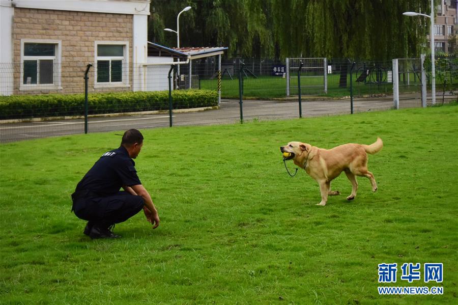 6月24日,訓導員周吉榮和緝毒犬“多多”在訓練場上互動。 新華社記者 鄭夢雨 攝