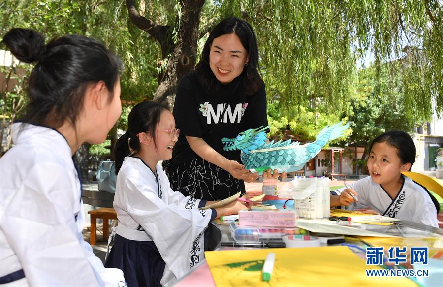 6月24日,西安市新城區(qū)后宰門小學的老師指導學生制作紙質龍舟模型。端午節(jié)臨近,各地舉行包粽子、做香包、賽龍舟等豐富多彩的民俗文化活動,迎接傳統(tǒng)佳節(jié)的到來。新華社記者劉瀟攝