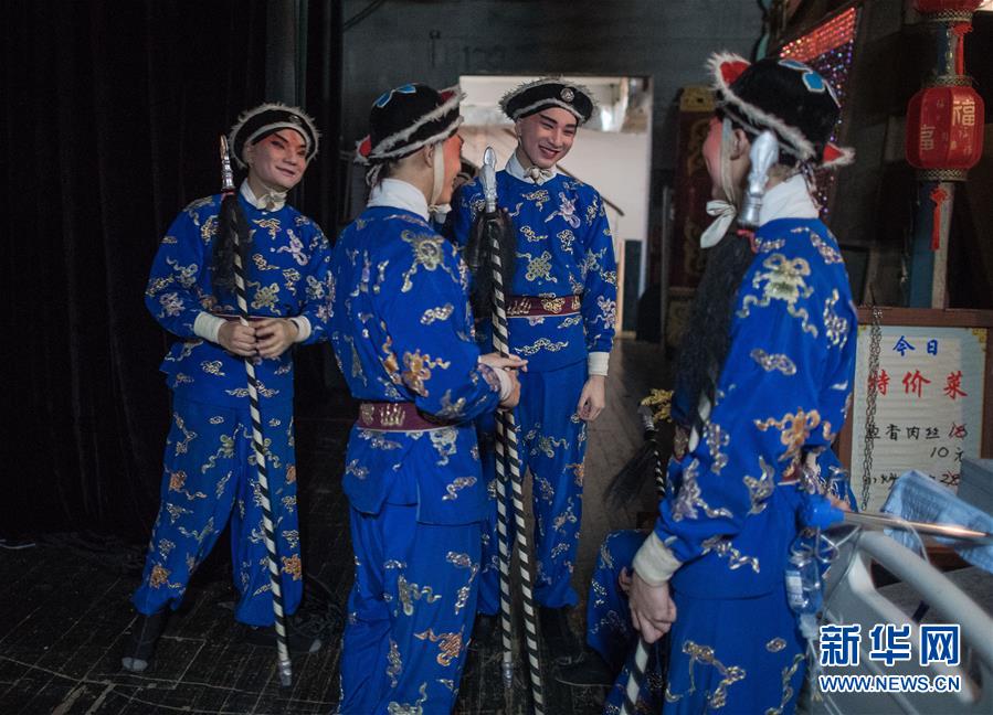 6月26日,在武漢市人民劇院,演員們?cè)诘桥_(tái)前準(zhǔn)備。新華社記者 肖藝九 攝
