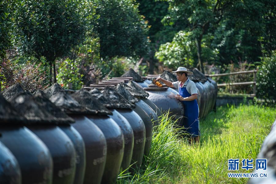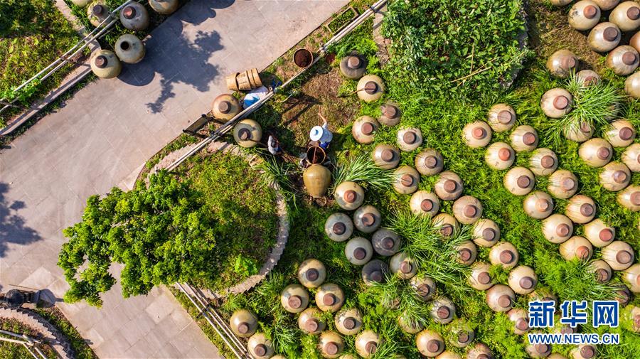 赤水曾氏曬醋廠晾曬的醋壇(6月26日攝,無(wú)人機(jī)照片)?!俺嗨畷翊住辈捎霉腆w發(fā)酵繁殖產(chǎn)生天然醋酸菌,醋醅和成品醋都在日光下曝曬而成,故稱(chēng)曬醋?!俺嗨畷翊住敝谱鳉v史悠久,工序考究,2009年被列入貴州省級(jí)非遺名錄。新華社記者 陶亮 攝