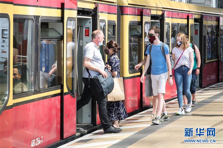 6月27日,在德國首都柏林,戴口罩的乘客出入一列城市快鐵列車。