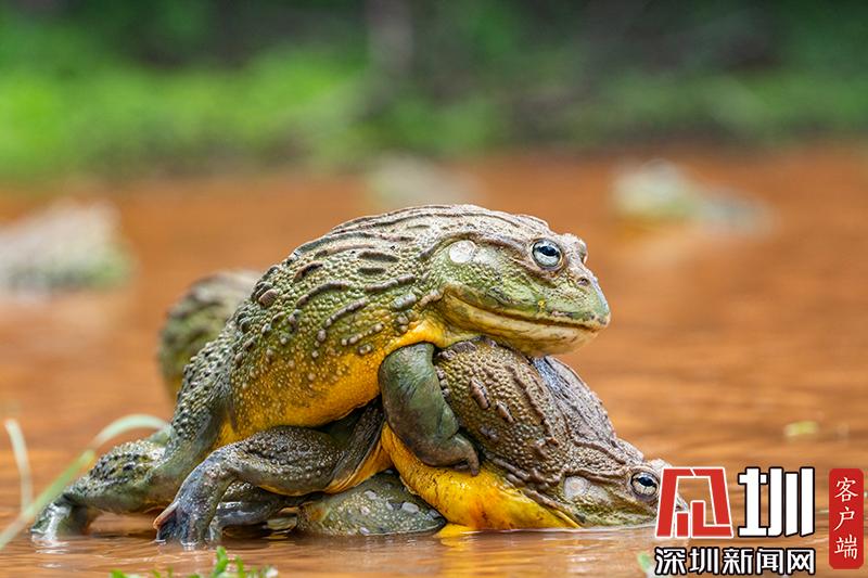 2020年6月30日報道(具體拍攝時間不詳),南非波羅克瓦克,兩只雄性非洲牛蛙為了爭奪雌性牛蛙,在池塘中打架,這樣的情形十分罕見。畫面中,戰(zhàn)況十分激烈,一只非洲牛蛙在另外一只試圖逃到池塘邊緣時撕咬對手,甚至將另外一只拋向空中。這些精彩的照片是由南非開普敦攝影師Temujin Johnson拍攝的。