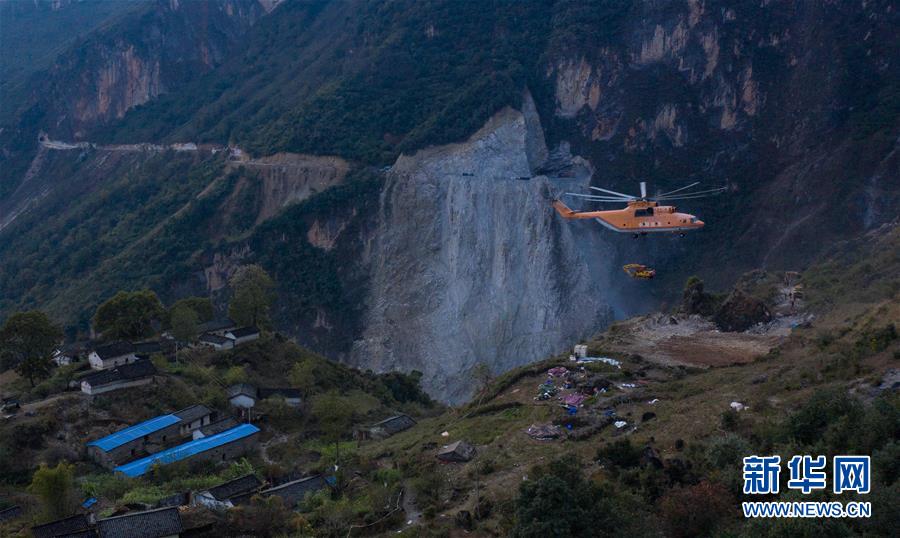 一架米-26重型直升機在布拖縣阿布洛哈村吊運挖掘機(2019年12月5日攝)。新華社記者江宏景攝