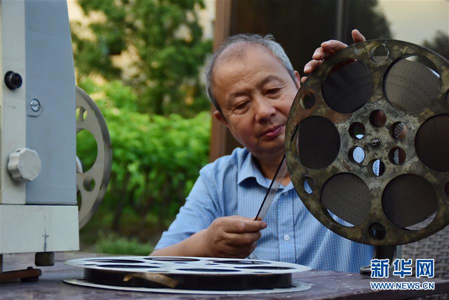 6月30日晚,電影放映中,朱強在更換膠片。新華社記者鄭夢雨攝