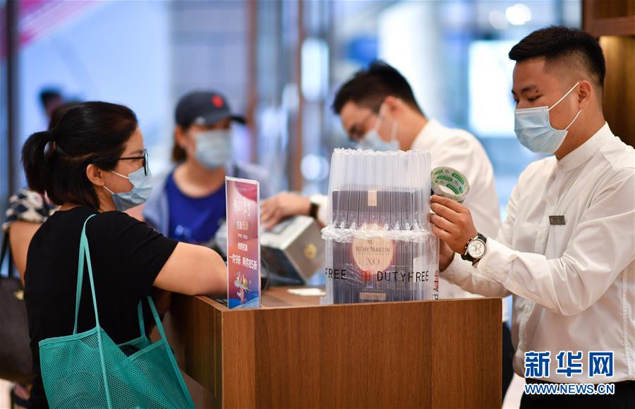 7月1日,??谌赵聫V場(chǎng)免稅店的工作人員為顧客打包酒類商品。當(dāng)日,海南開始實(shí)施調(diào)整后的離島免稅購(gòu)物政策。海南離島旅客每年每人免稅購(gòu)物額度提高至10萬(wàn)元,電子消費(fèi)產(chǎn)品等7類新增商品開售。新華社記者郭程攝