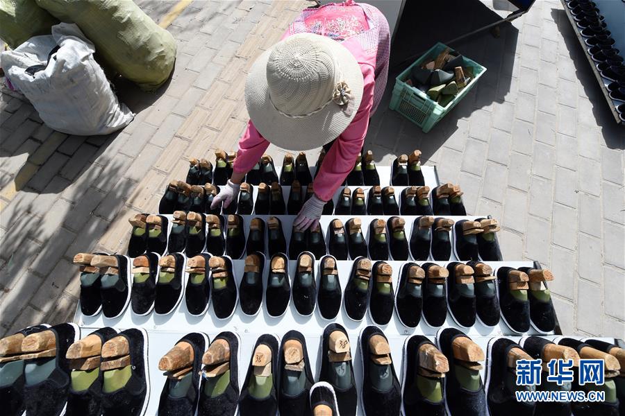 7月2日,臨夏縣百利布鞋加工農(nóng)民專業(yè)合作社員工在擺放布鞋。甘肅省臨夏回族自治州臨夏縣將布鞋加工定為重點扶持發(fā)展的產(chǎn)業(yè),采用“政府+公司+貧困戶”的產(chǎn)業(yè)扶貧模式,由政府主導(dǎo)、企業(yè)出資,在貧困村建設(shè)“扶貧車間”,吸納貧困群眾從事布鞋加工產(chǎn)業(yè)增加收入。截至2019年底,當(dāng)?shù)夭夹庸て髽I(yè)和加工戶遍及近百個行政村,從業(yè)人員達(dá)到4000多人,累計生產(chǎn)布鞋600多萬雙,實現(xiàn)銷售收入2.32億元。新華社記者范培珅攝