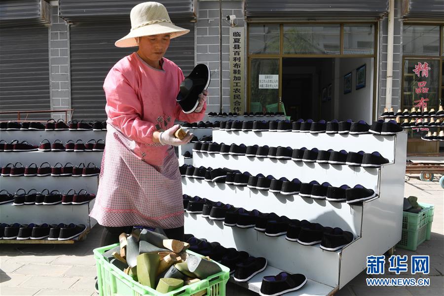 7月2日,臨夏縣百利布鞋加工農(nóng)民專業(yè)合作社員工在擺放布鞋。甘肅省臨夏回族自治州臨夏縣將布鞋加工定為重點(diǎn)扶持發(fā)展的產(chǎn)業(yè),采用“政府+公司+貧困戶”的產(chǎn)業(yè)扶貧模式,由政府主導(dǎo)、企業(yè)出資,在貧困村建設(shè)“扶貧車間”,吸納貧困群眾從事布鞋加工產(chǎn)業(yè)增加收入。截至2019年底,當(dāng)?shù)夭夹庸て髽I(yè)和加工戶遍及近百個(gè)行政村,從業(yè)人員達(dá)到4000多人,累計(jì)生產(chǎn)布鞋600多萬雙,實(shí)現(xiàn)銷售收入2.32億元。新華社記者范培珅攝