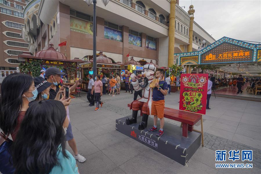 游客在烏魯木齊大巴扎美食街前拍照留念(7月4日攝)。夏日周末,烏魯木齊市大巴扎景區(qū)內(nèi)熙熙攘攘,人們來到這里品嘗美食、休閑購物。2018年,經(jīng)過靚化改造后的大巴扎景區(qū)新增長約800米的步行街,分為文創(chuàng)文旅和“非遺”項(xiàng)目街區(qū)、國際時(shí)尚街區(qū)和大巴扎美食街區(qū),是烏魯木齊最受歡迎的旅游目的地之一。新華社記者趙戈攝
