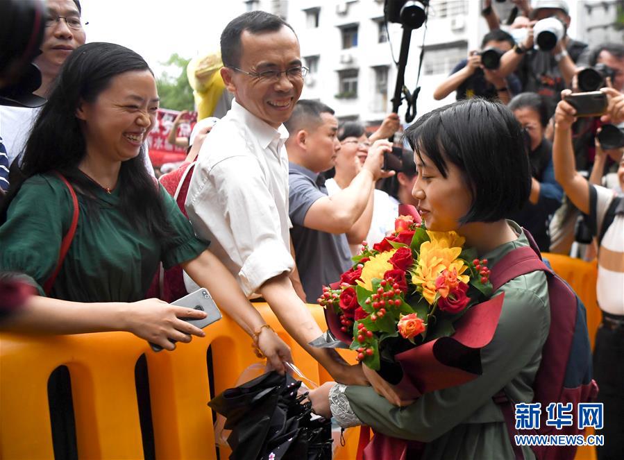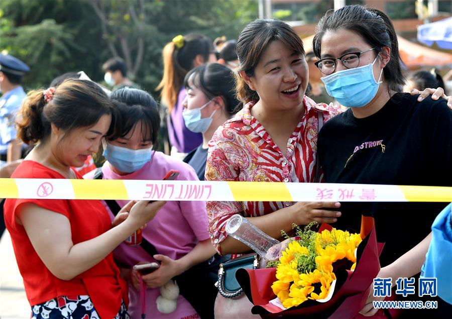 7月8日,一名考生(右)在湖南省長(zhǎng)沙市一中考點(diǎn)外從家長(zhǎng)手中接過鮮花。當(dāng)日,全國(guó)部分地區(qū)2020年高考結(jié)束。新華社記者薛宇舸攝
