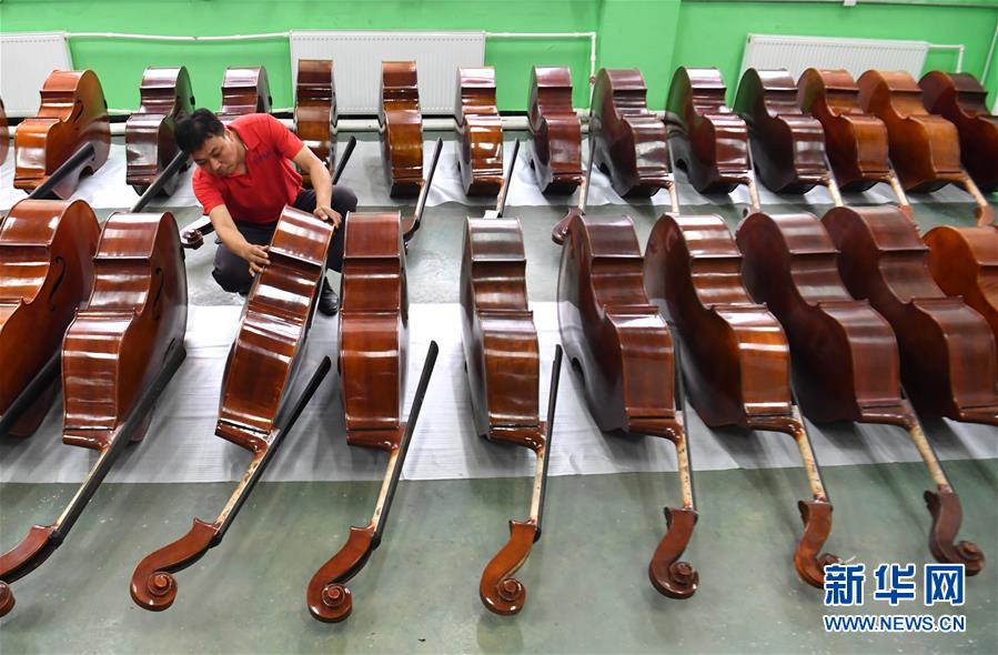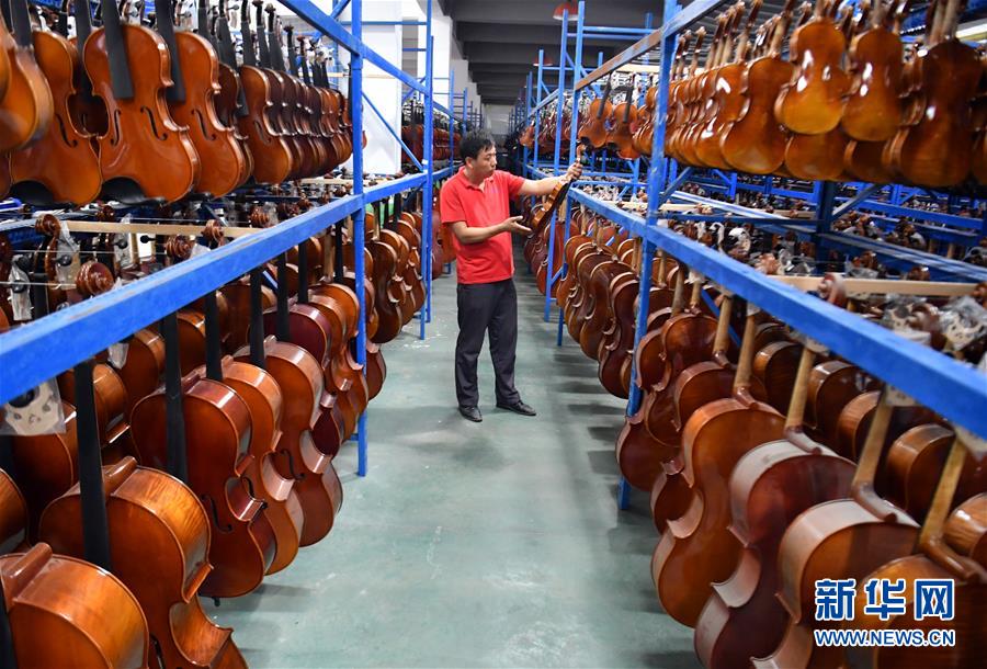 工人在河南駐馬店市確山縣提琴產(chǎn)業(yè)園提琴生產(chǎn)車間檢查提琴質(zhì)量(6月23日攝)。新華社記者李嘉南攝