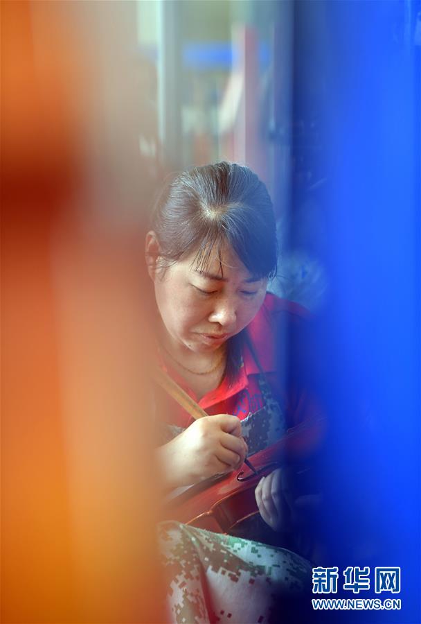 工人在河南駐馬店市確山縣提琴產(chǎn)業(yè)園提琴生產(chǎn)車間雕刻琴頭(7月3日攝)。新華社記者李嘉南攝