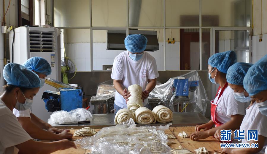 7月8日,張亞釗(中)在車間加工面團(tuán)。新華社記者韓朝陽(yáng)攝