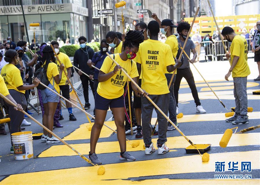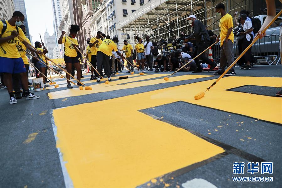 7月9日,在美國紐約第五大道特朗普大廈前,人們涂寫“黑人的命也是命”標語。當天,數(shù)十人在紐約第五大道特朗普大廈前的路面上涂寫“黑人的命也是命”標語。紐約市計劃在多處地點涂寫“黑人的命也是命”標語。新華社記者王迎攝