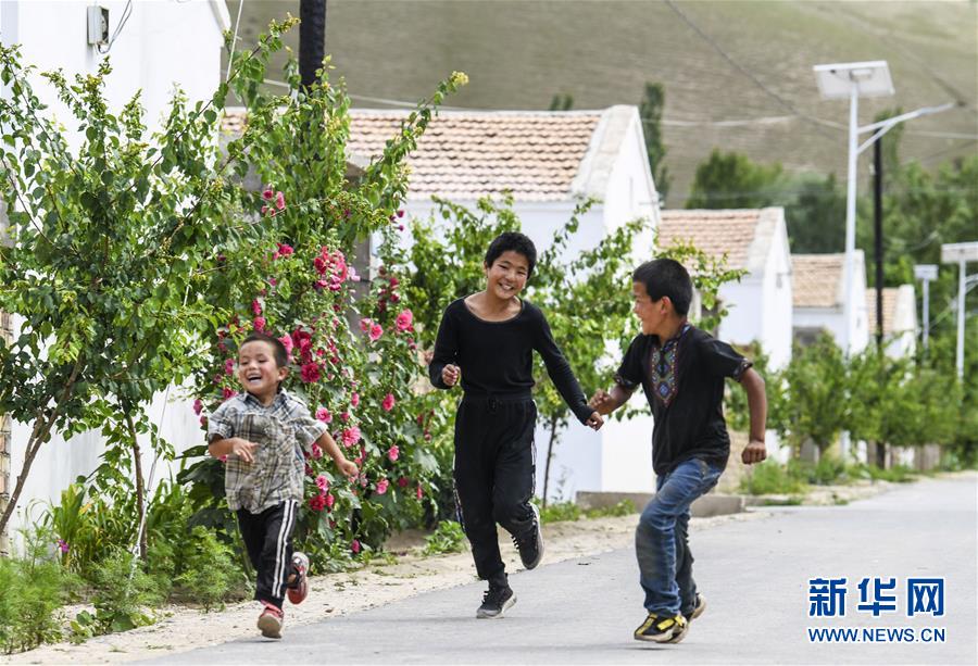 在新疆特克斯縣境內(nèi)的牧民定居點(diǎn),小朋友在巷道內(nèi)追逐玩耍(7月6日攝)。新華社記者王菲攝