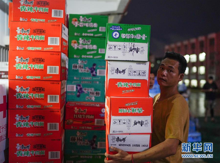 7月9日,工作人員在搬運供安置點村民食用的方便面。當日,江西鄱陽縣鄱陽鎮(zhèn)因洪水受災的村民被轉(zhuǎn)移到多個集中安置點。在鄱陽縣五一中心學校安置點,志愿者和工作人員接到任務后不到十小時內(nèi),為被轉(zhuǎn)移村民布置了28間教室,供519人安頓,并為村民發(fā)放褥子、床單、枕頭、盒飯、飲用水等物資。新華社記者周密攝