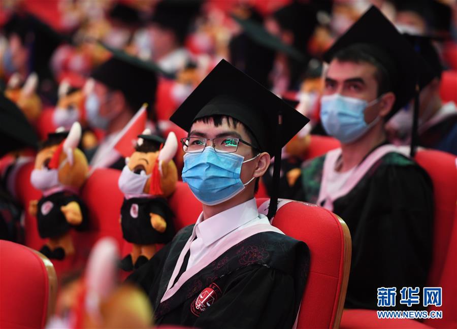 7月10日拍攝的中國(guó)政法大學(xué)2020屆畢業(yè)典禮現(xiàn)場(chǎng)。當(dāng)日,中國(guó)政法大學(xué)舉行2020屆畢業(yè)典禮。由于疫情防控需要,僅少量在校畢業(yè)生在中國(guó)政法大學(xué)昌平校區(qū)禮堂現(xiàn)場(chǎng)參加畢業(yè)典禮,更多畢業(yè)生通過(guò)線上直播參與。新華社記者任超攝