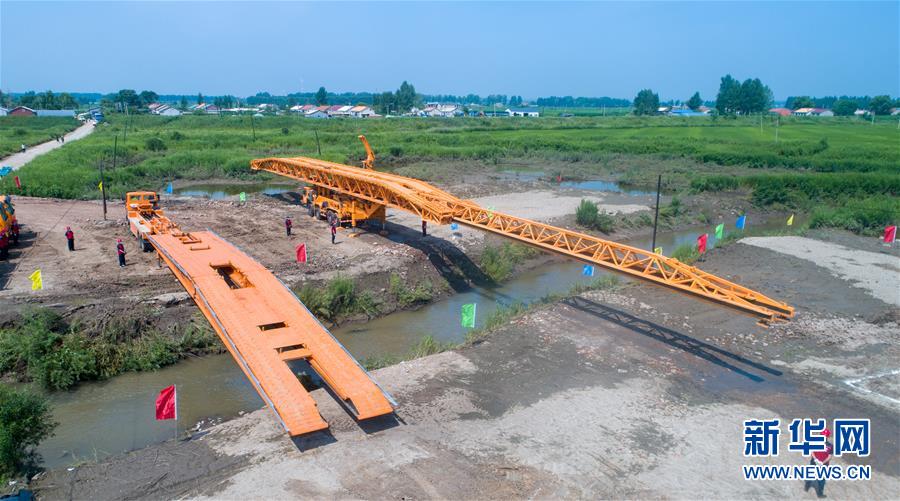 7月10日,工作人員在演練現(xiàn)場搭建機械化橋梁(無人機照片)。當(dāng)日,由吉林省交通運輸廳主辦的公路橋梁水毀搶通應(yīng)急演練在長春市雙陽區(qū)雙陽河舉行,參與演練人員從汛情水毀信息報送、應(yīng)急裝備快速集結(jié)、機械化橋梁搶通搭設(shè)、善后處理等方面進(jìn)行實戰(zhàn)演練。新華社記者張楠攝