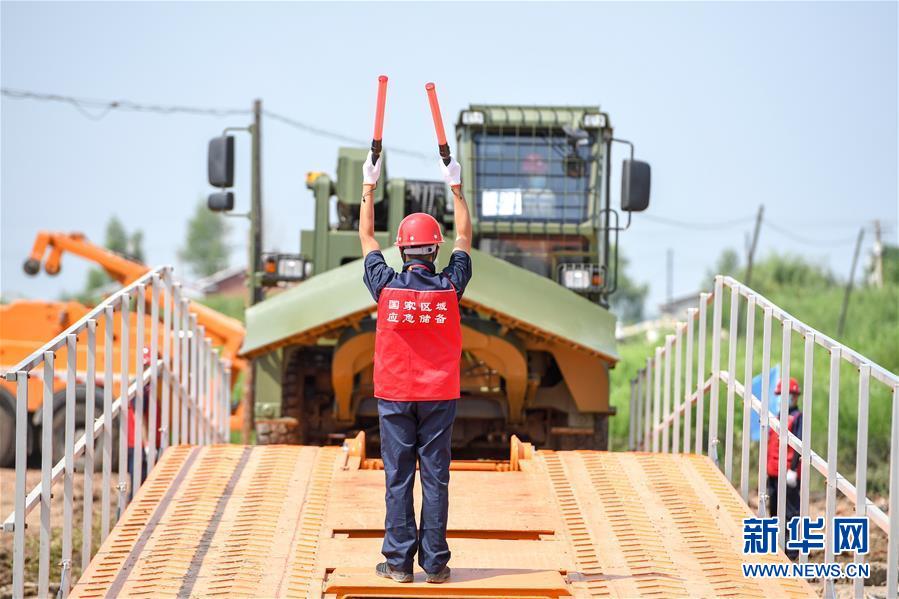 7月10日,工作人員引導(dǎo)多功能應(yīng)急搶險車安全過橋。當(dāng)日,由吉林省交通運輸廳主辦的公路橋梁水毀搶通應(yīng)急演練在長春市雙陽區(qū)雙陽河舉行,參與演練人員從汛情水毀信息報送、應(yīng)急裝備快速集結(jié)、機械化橋梁搶通搭設(shè)、善后處理等方面進(jìn)行實戰(zhàn)演練。新華社記者張楠攝