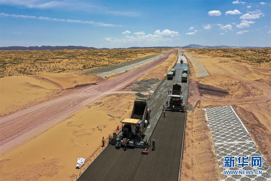 7月10日,位于寧夏境內(nèi)的烏瑪高速青銅峽至中衛(wèi)段A10標(biāo)段在施工中(無(wú)人機(jī)照片)。盛夏時(shí)節(jié),位于寧夏境內(nèi)的烏瑪(內(nèi)蒙古烏海市至青?,斍呖h)高速青銅峽至中衛(wèi)段正在抓緊施工建設(shè)。該路段主線全長(zhǎng)122.9公里,其中穿越騰格里沙漠腹地的18公里公路是寧夏建設(shè)的首條沙漠高速公路,預(yù)計(jì)2021年建成通車。新華社記者馮開華攝。