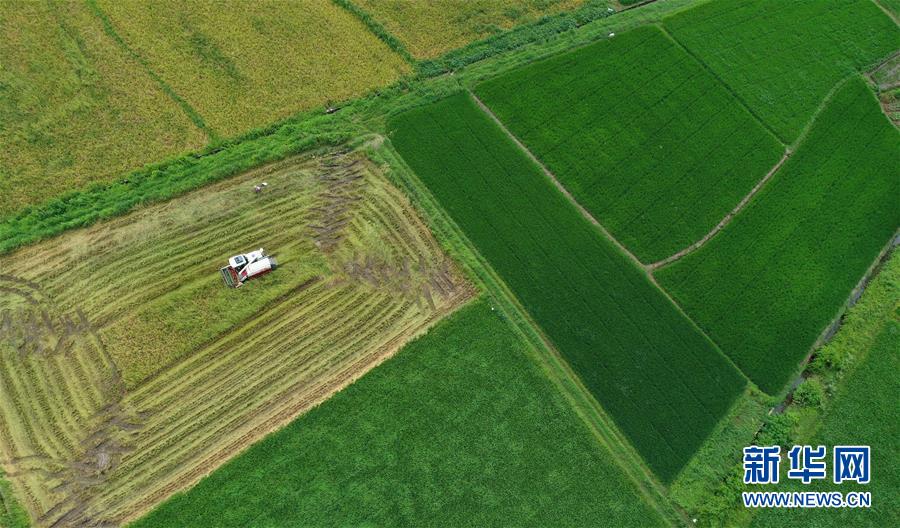 7月11日,在湖南省衡陽市衡陽縣臺源鎮(zhèn)臺九村,村民駕駛收割機收割早稻(無人機照片)。近日,湖南各地農(nóng)村陸續(xù)進入“雙搶”季,農(nóng)民緊抓農(nóng)時,搶收搶種,力爭糧食穩(wěn)產(chǎn)豐收。新華社記者趙眾志攝