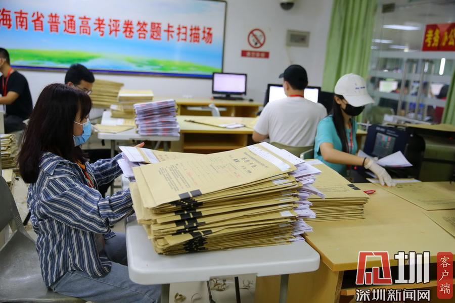 2020年7月13日,在海南師范大學高考評卷場,工作人員仔細拆封考卷并進行掃描入電腦,整個過程井然有序。在評卷現場的入口,除了有武警把守之外,所有工作人員進入到評卷場均有專人使用手柄式金屬探測器對其進行安檢,并通過身份證識別系統(tǒng)中進行身份識別,方可以進入??忌痤}卡由武警24小時值守,并實行嚴密的視頻監(jiān)控。